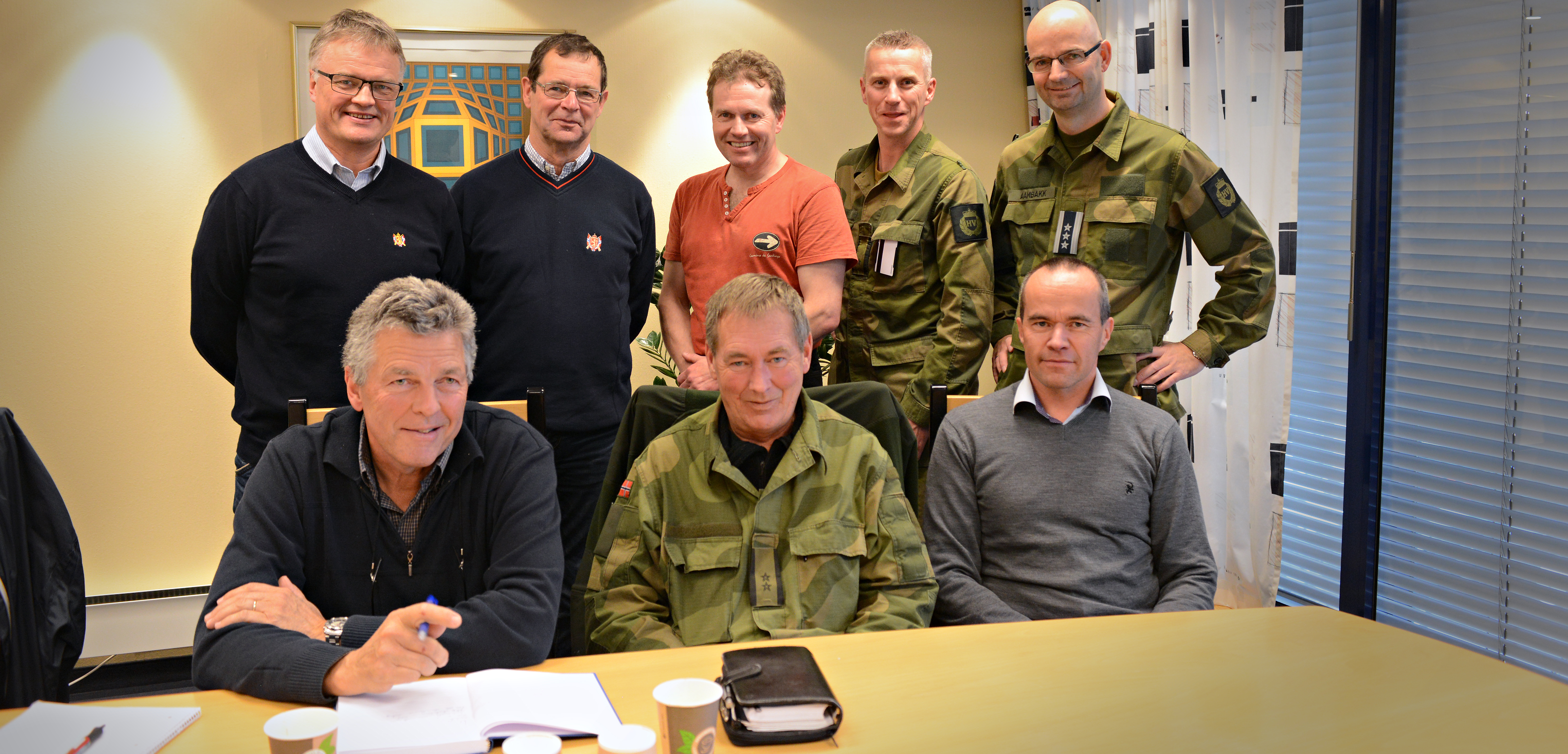 Det ble et godt møte mellom representanter fra Forsvarsbygg, HV-staben og Miljødirektoratet samt Det frivillige Skyttervesen. Foran fra venstre:: Esten Murbrech (HV), Per Siem (Forsvarsbygg), Bak fra venstre.: jt, Jens Sverre Knutsen, Torstein Finnesand (Miljødirektoratet), Tormod Strand (HV), Jo Inge Aambakk (HV)