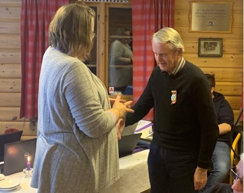 Åge Sætre får her tildelt Hedmark skyttersamlags fortjenestemedalje av samlagsleder Kristin Christophersen.
