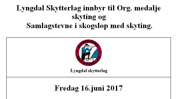 Lyngdal arrangerer Org.medalje skyting og skogsløp med skyting på skytebanen fredag fra kl 17.00 på skytebanen. Det vil bli satt opp kun 3 lag på 100m og 200m til Org.skyting. Skogsløp med skyting vil starte umiddelbart etter at Organisasjon skytingen er ferdig. Ca kl 19.00..
